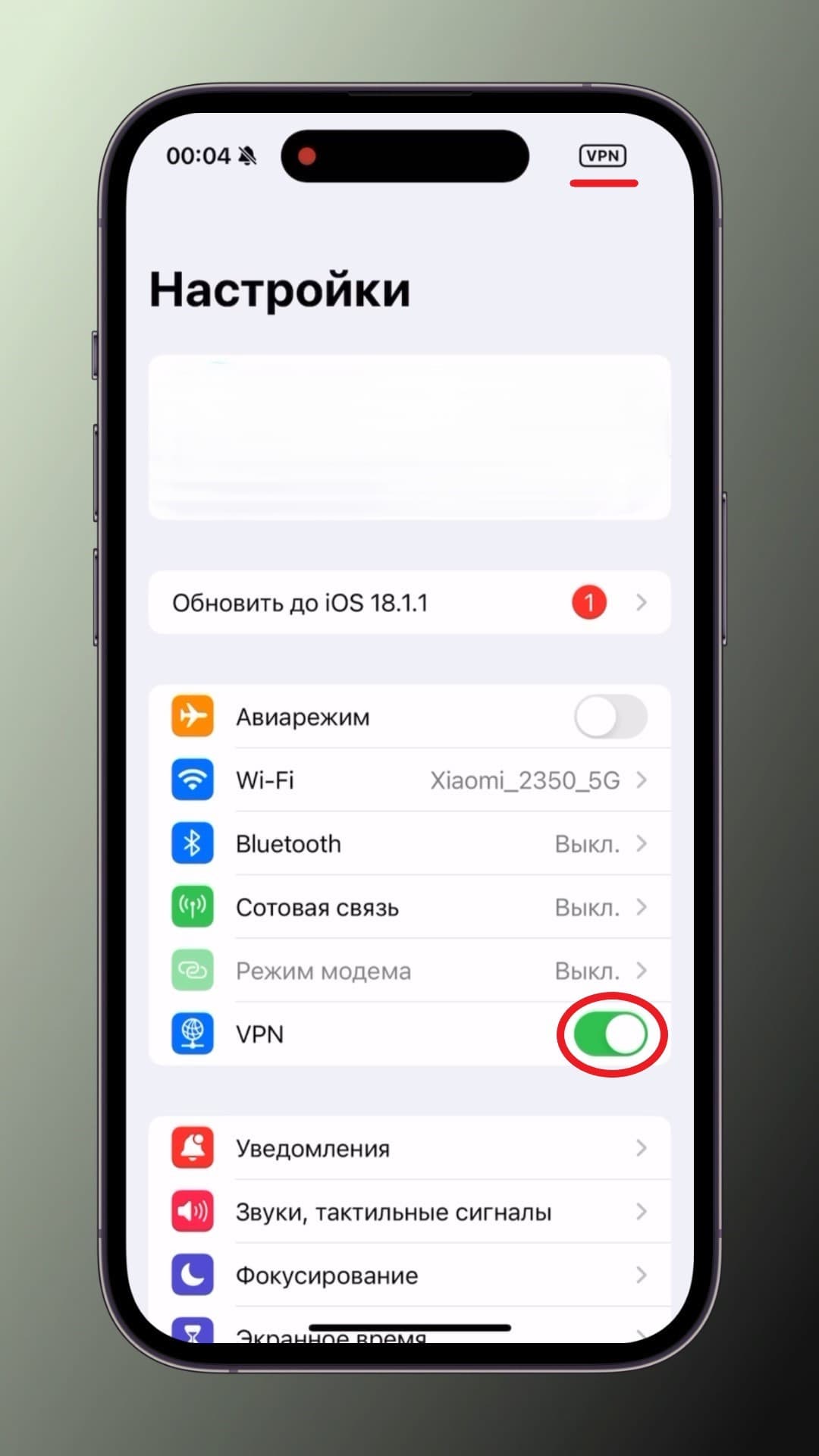 Шаг 6. После сохранения настроек выше заходим еще раз в настройки и нажимаем на ползунок "VPN", после чего увидим успешное подключение к VPN.