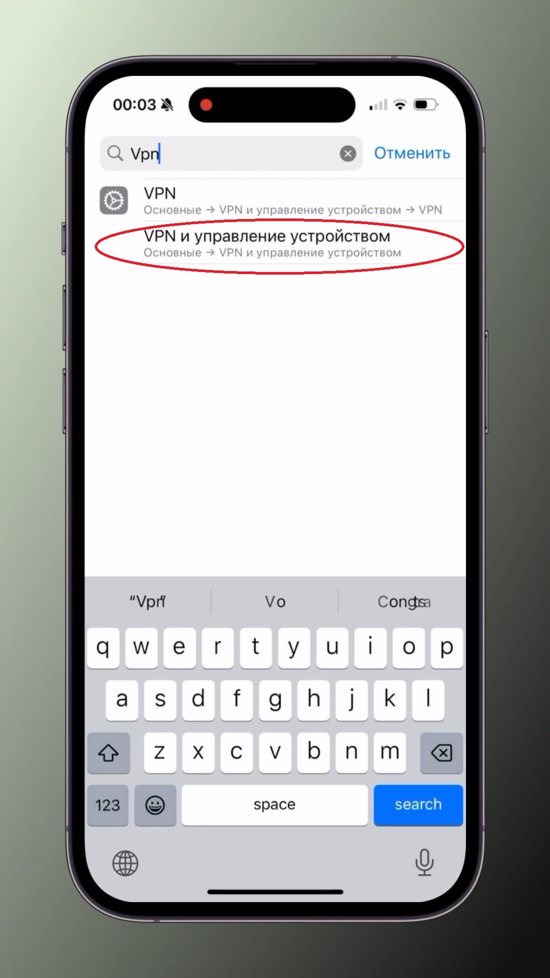 Шаг 1. В настройках Вашего IPhone в самом верху находим поисковую строку