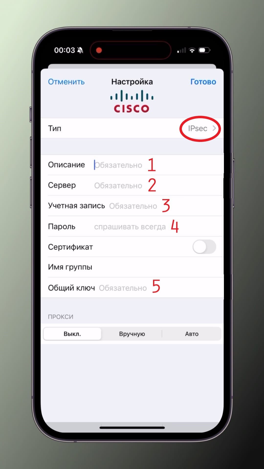 Тип: Указываем > IPsec; (1) Описание можно вставить любое, рекомендуем - Underline VPN; (2) Сервер; (3) Учетная запись (пользователь); (4) Пароль; (5) Общий ключ;
