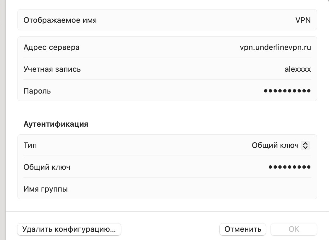 (1) Отображаемое имя можно вставить любое, рекомендуем - Underline VPN;