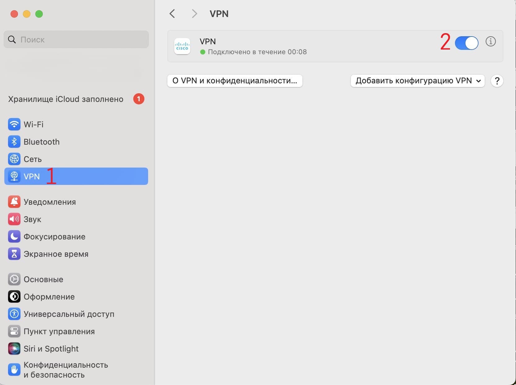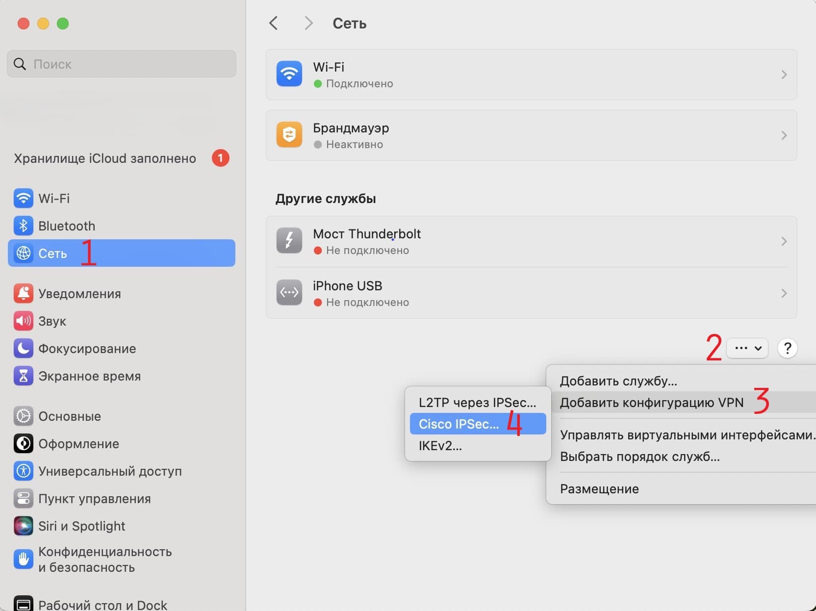 В настройках Вашего MacOS выбираем пункт Сеть > выбираем (три точки) > Добавить конфигурацию VPN> Cisco iPSec: