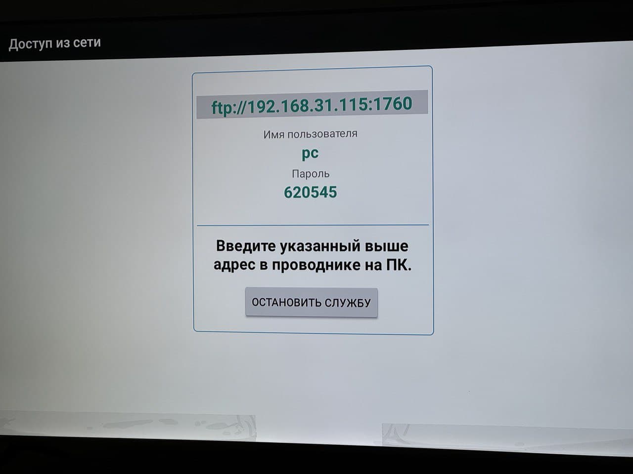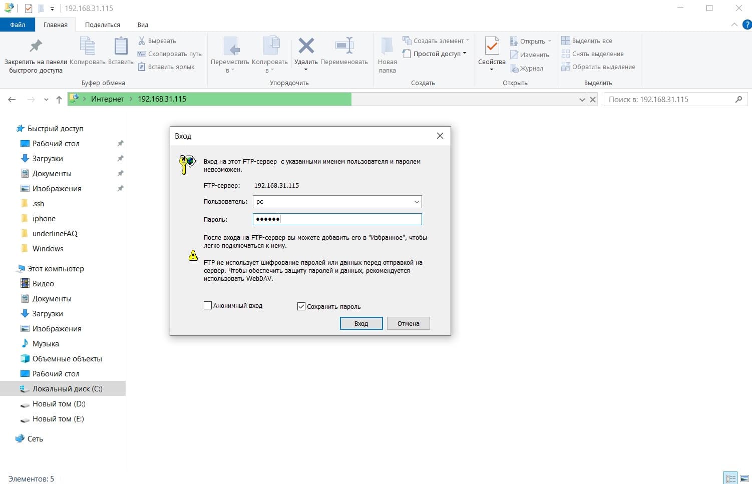 Шаг 4. В Вашем компьютере в ссылочной строке расположения файлов берем значение из шага выше "ftp://..." и нажимаем Enter, после чего откроется окно и необходимо будет ввести имя пользователя и пароль также из шага 3 ❌ Важно что бы подключенный ноутбук/компьютер были подключены к одной сети Wi-fi